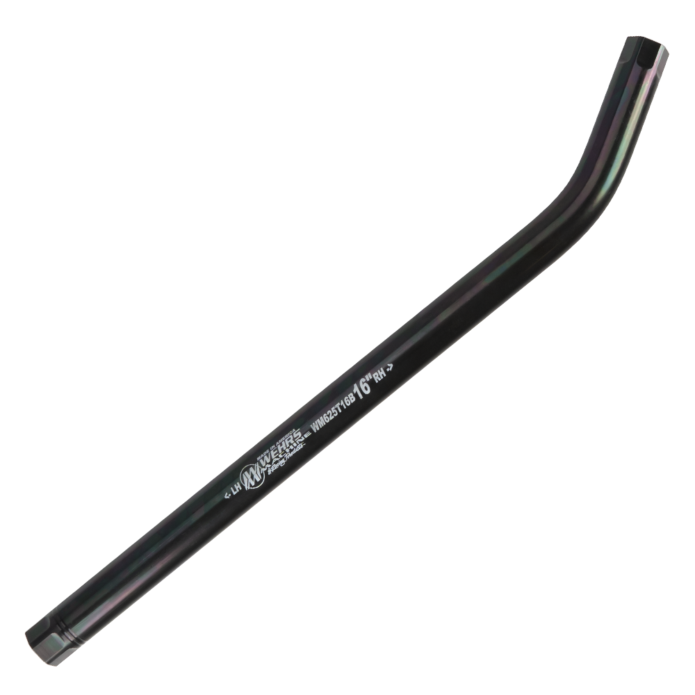 These are our 5/8” bent suspension tubes for clearance for the suspension cage. Tubes are machined from DOM steel tube for strength. Tubes have 13/16″ hex on each end and are lasered with length and thread direction. This is our 16” bent bar.