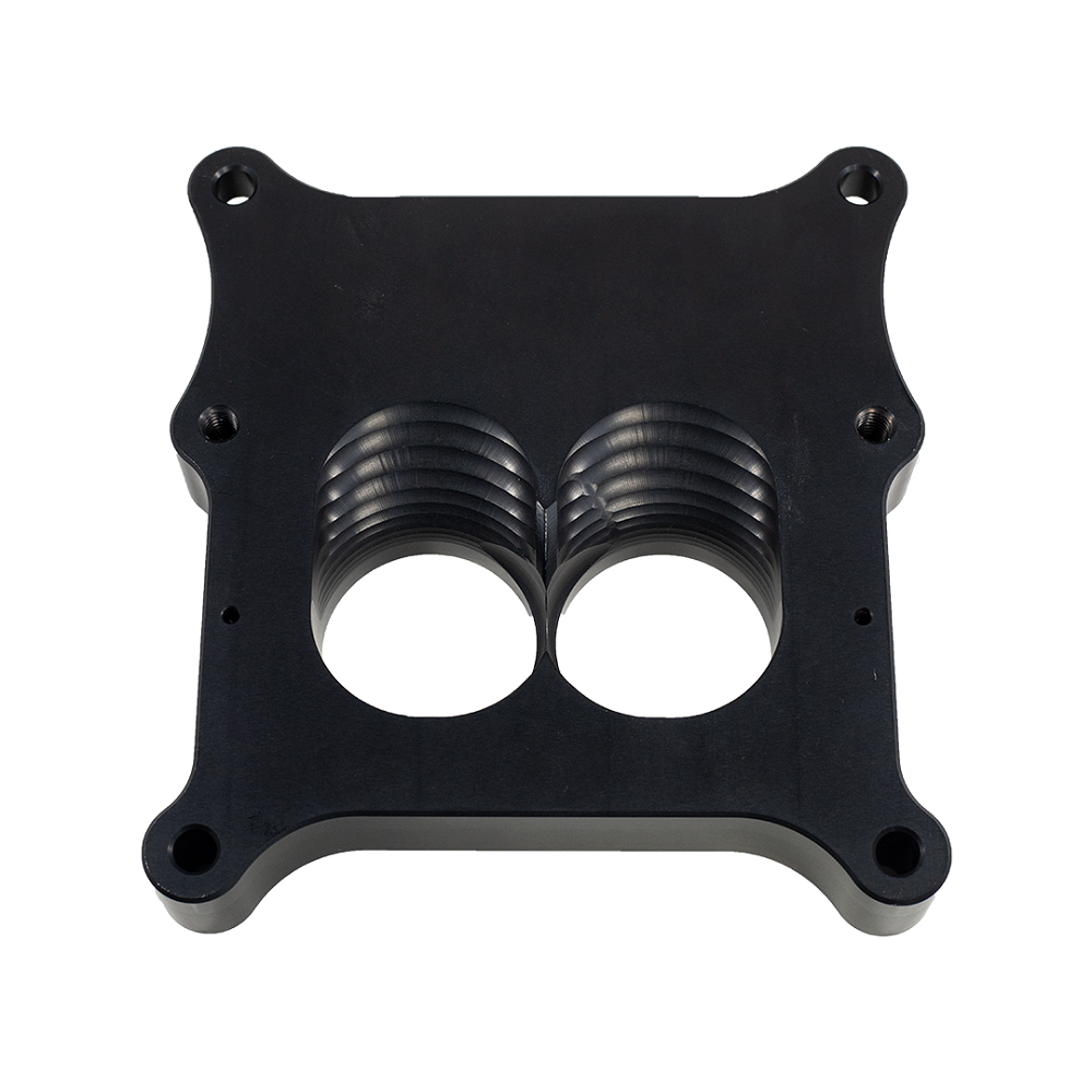 Our 2BRL into 4BRL carb adapter spacers adapt a 4412 Holley 2BRL to a 4BRL Holley pattern intake. This spacer is flared and swirled for superior horsepower.
