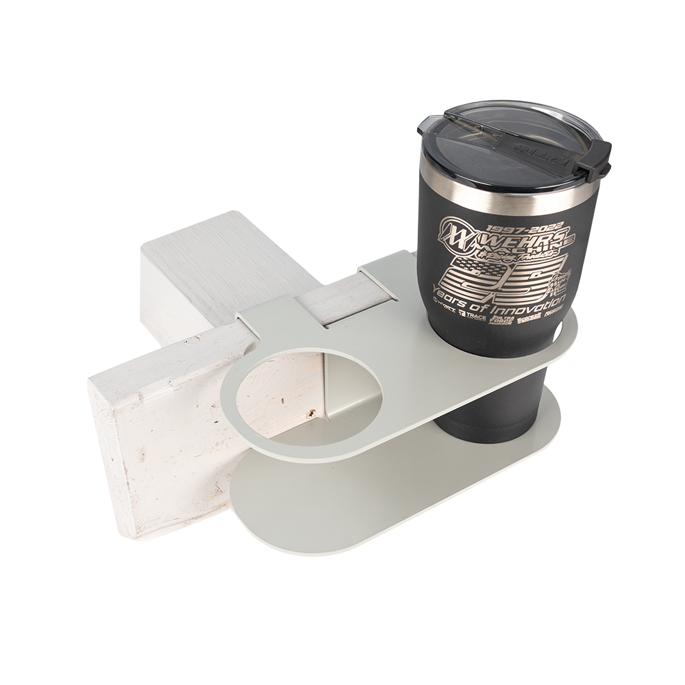 Drink holder for any size 2″ board. (2×4, 2×6, etc.) Slides over the board with tabs to hold it in place. There is a screw hole located on the face of the drink holder that you can use to secure it to the board.