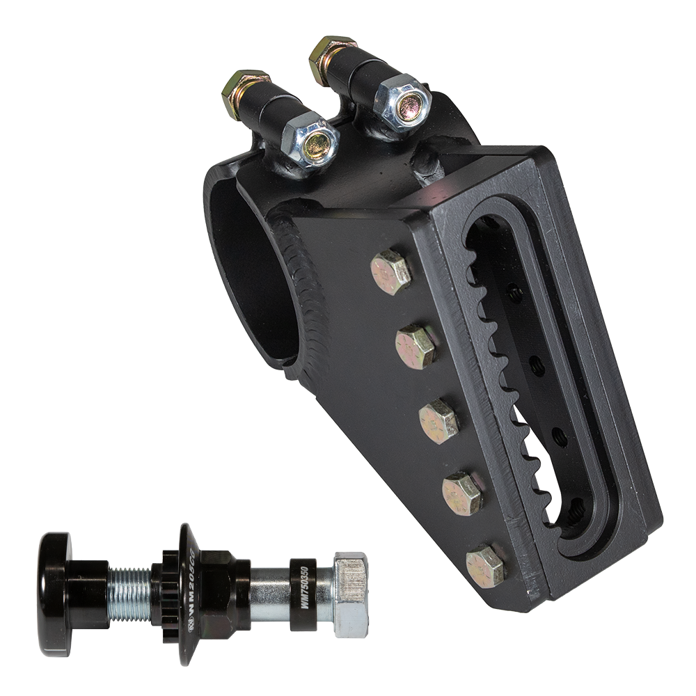 Mount clamps on 3” OD axle tube and mounts the panhard bar at a forward angle. Mount uses climber nut for quick adjustment. The slot is 4” long, this mount is lowered  1-1/2″ compared to the centered version.  Mount comes with climber hardware.