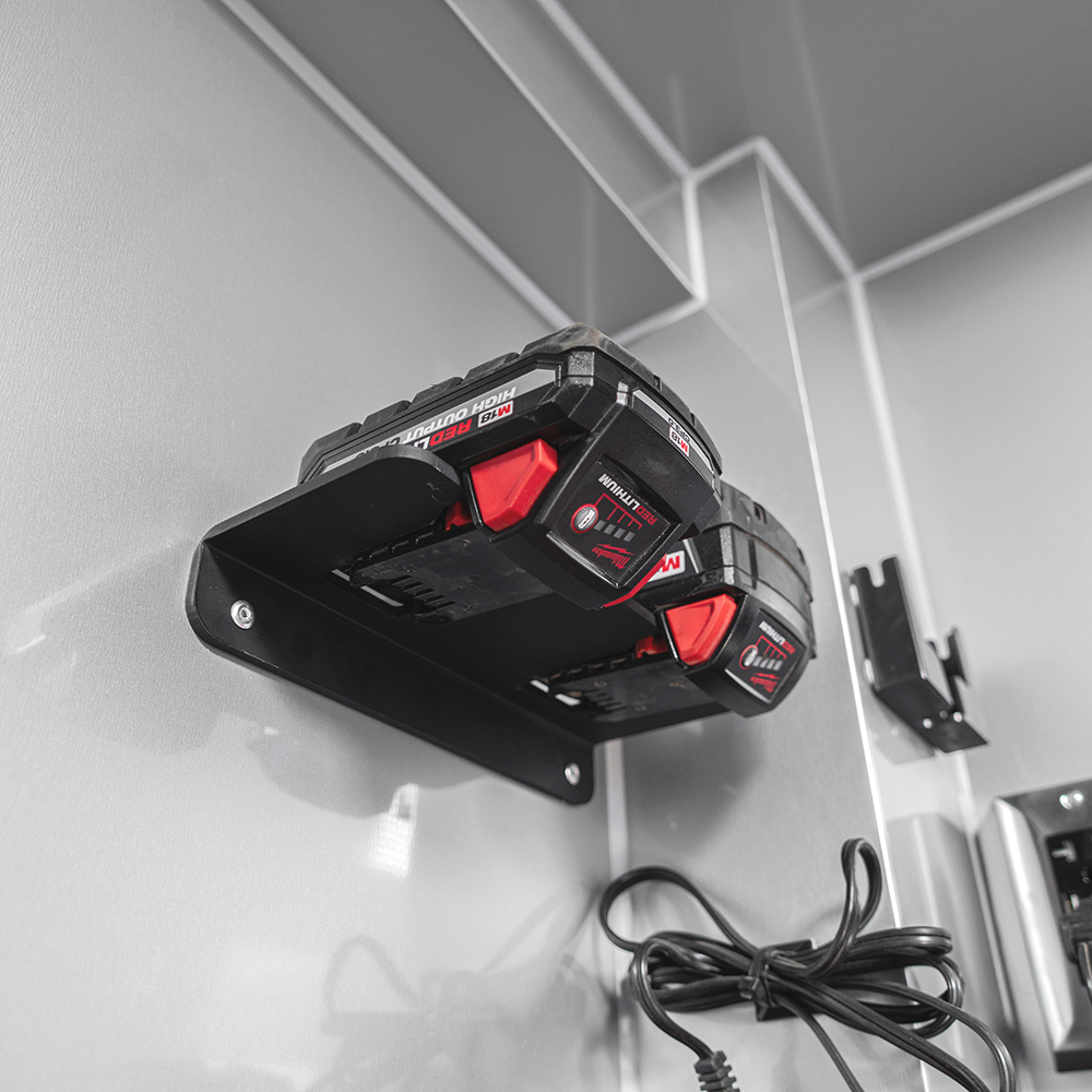Our battery holder is designed to hold 2 Milwaukee M18 batteries with retention. The holder has 2 holes to mount to a wall that are approximately 8″ on center.