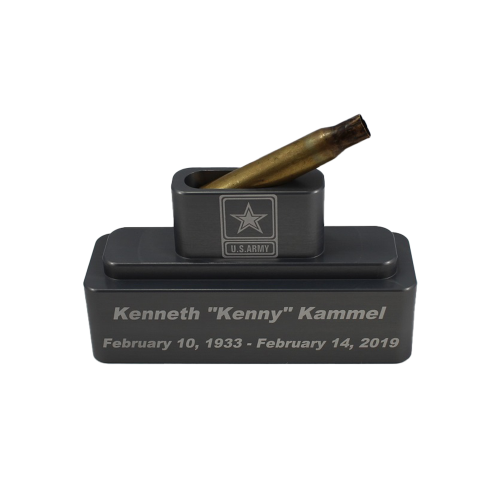 This is our memorial shell casing holder. This billet aluminum holder is a great way to display shell casings. We will laser the branch of military, name, and DOB to DOD for no extra charge. Other laser options also available give us a call at 608-486-4343.